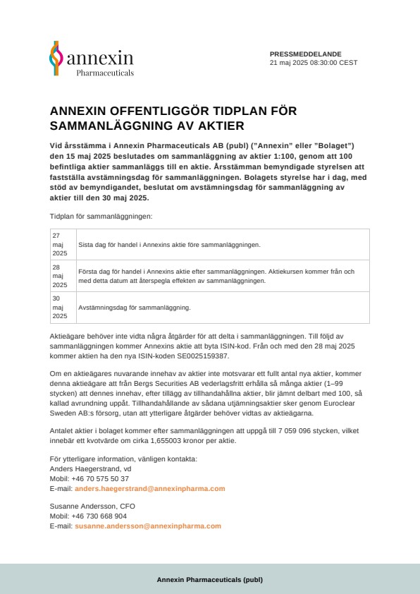 Vid årsstämma i Annexin Pharmaceuticals AB (publ) (”Annexin” eller ”Bolaget”) den 15 maj 2025 beslutades om sammanläggning av aktier 1:100, genom att 100 befintliga aktier sammanläggs till en aktie. Årsstämman bemyndigade styrelsen att fastställa avstämningsdag för sammanläggningen. Bolagets styrelse har i dag, med stöd av bemyndigandet, beslutat om avstämningsdag för sammanläggning av aktier till den 30 maj 2025.