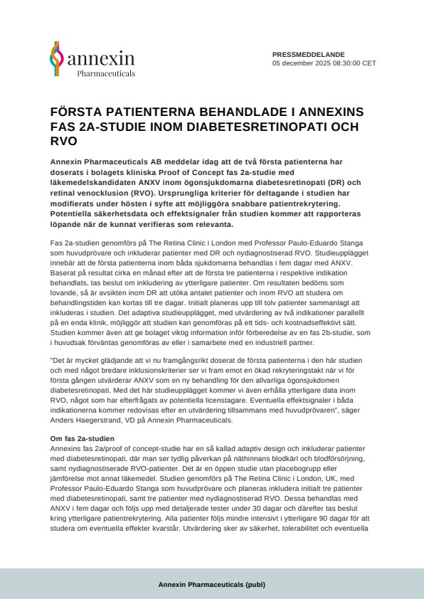 ”Det är mycket glädjande att vi nu framgångsrikt doserat de första patienterna i den här studien och med något bredare inklusionskriterier ser vi fram emot en ökad rekryteringstakt när vi för första gången utvärderar ANXV som en ny behandling för den allvarliga ögonsjukdomen diabetesretinopati. Med det här studieupplägget kommer vi även erhålla ytterligare data inom RVO, något som har efterfrågats av potentiella licenstagare. Eventuella effektsignaler i båda indikationerna kommer redovisas efter en utvärdering tillsammans med huvudprövaren”, säger Anders Haegerstrand, VD på Annexin Pharmaceuticals.